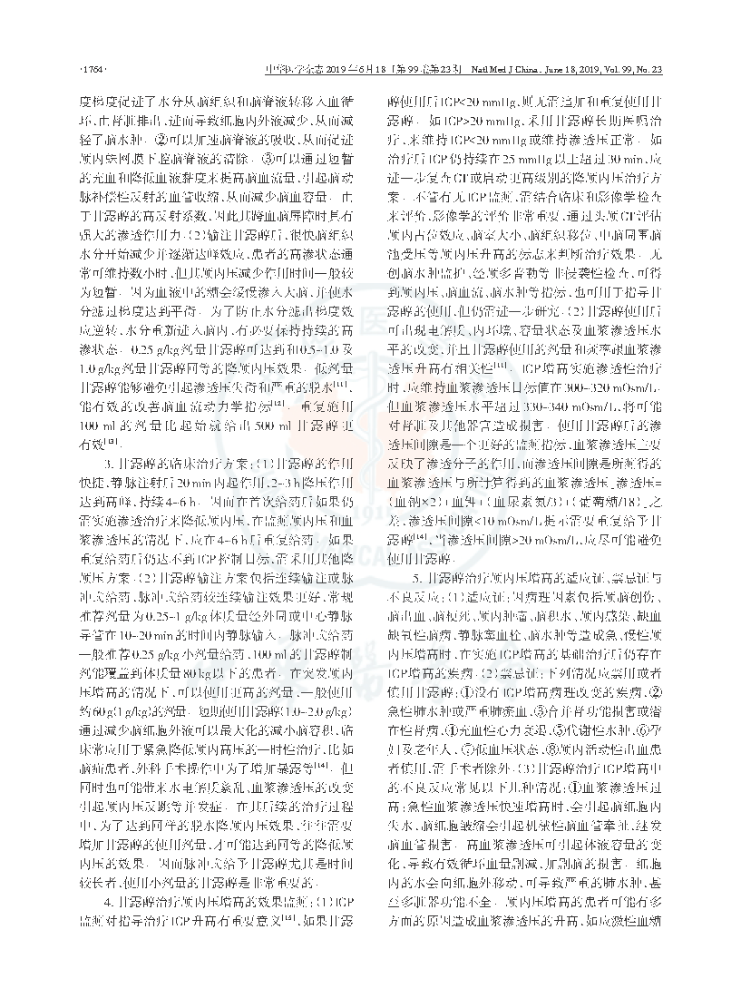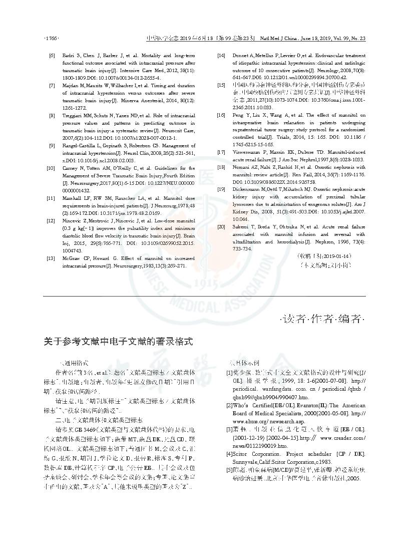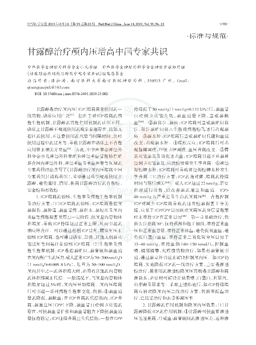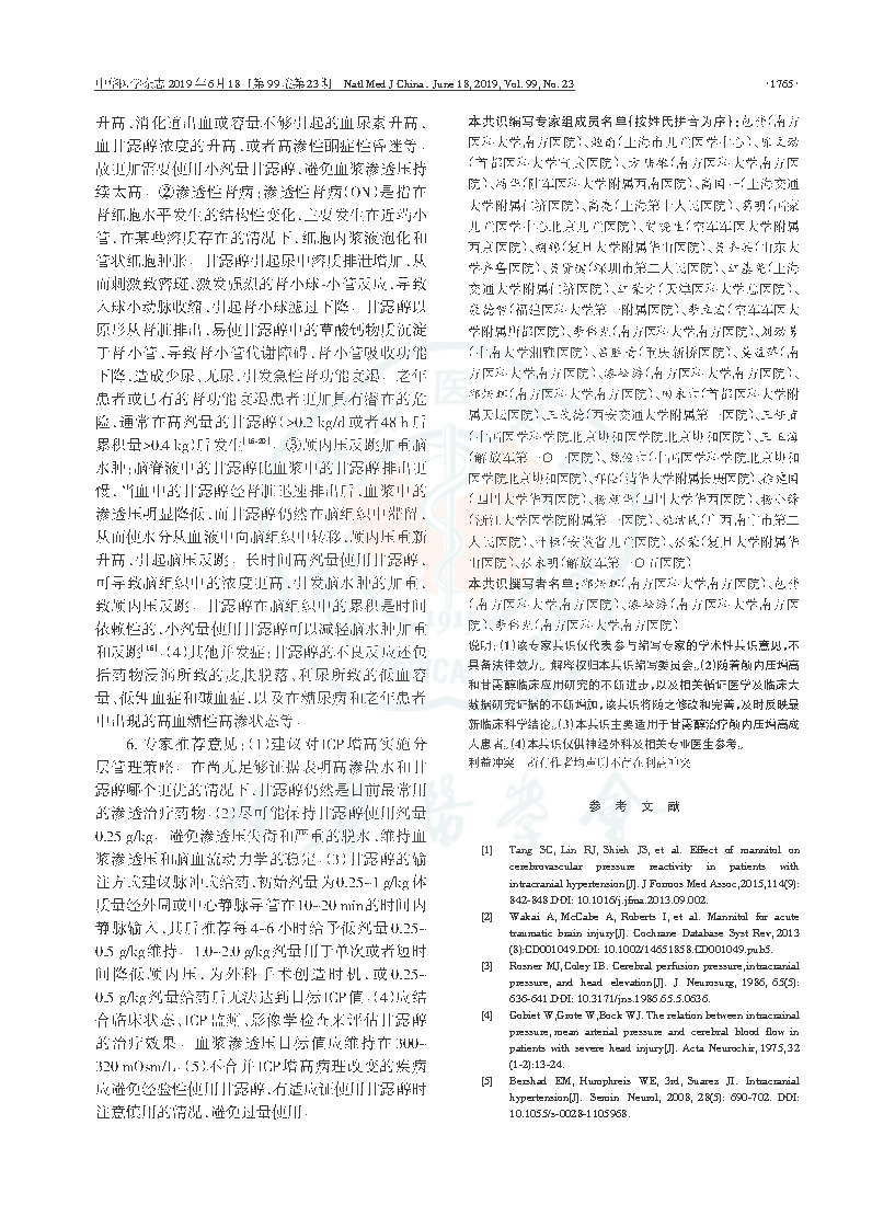 引用本文: 中华医学会神经外科学分会小儿学组, 中华医学会神经外科学分会神经重症协作组, 《甘露醇治疗颅内压增高中国专家共识》编写委员会. 甘露醇治疗颅内压增高中国专家共识 [J] . 中华医学杂志,2019,99 (23): 1763-1766. DOI: 10.3760/cma.j.issn.0376-2491.2019.23.002
