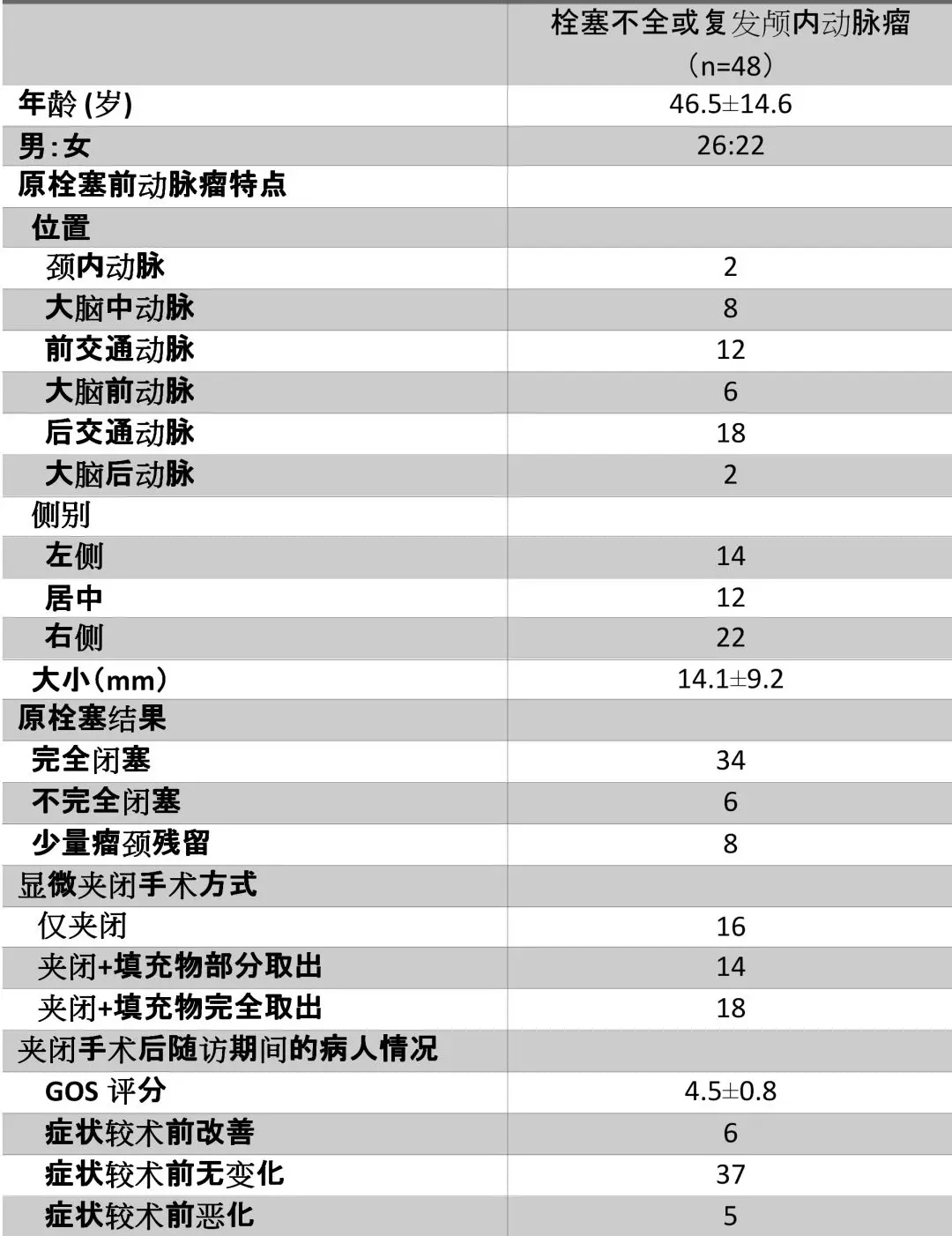 表1.所有栓塞不全或复发颅内动脉瘤的临床特点及手术信息