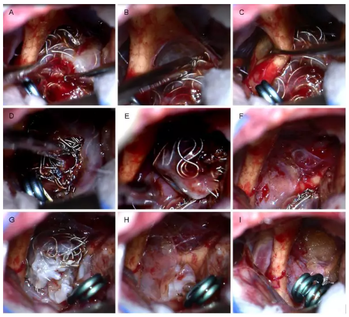图三:如图是上述病人的术中所见。在术中可见动脉瘤内的填充物向外突出,且视交叉被填充物压迫(A-C);完全显露并阻断动脉瘤近端和远端血管后,我们将填充物和周围粘连组织分离,然后取出(D-F);然后通过调整动脉瘤内剩下填充物的位置,使瘤颈充分暴露,制造夹闭空间(G);夹闭瘤颈后,再将剩余的动脉瘤内填充物取出,并在第一个夹子后再上一个动脉瘤夹以保证动脉瘤被完全夹闭(H-I)。