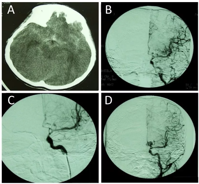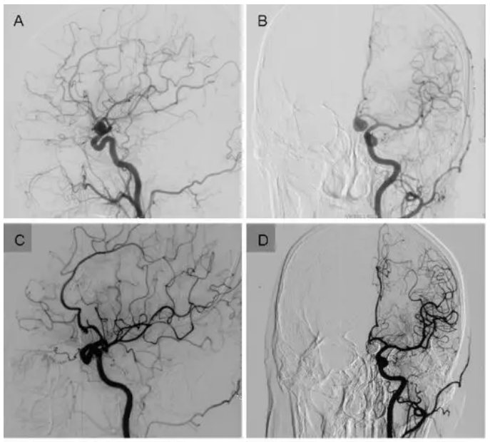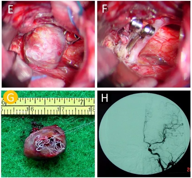 图一:如图是一个12岁的男性破裂动脉瘤患者。破裂动脉瘤位于左侧前交通动脉A1段(A-B);经介入治疗后,可见动脉瘤完全闭塞(C);但术后3个月的随访DSA显示该动脉瘤复发(D);在术中可见动脉瘤内的填充物(E);将动脉瘤及填充物移除后,成功夹闭动脉瘤(F-G);术后复查DSA显示动脉瘤完全闭塞,未见复发(H)。