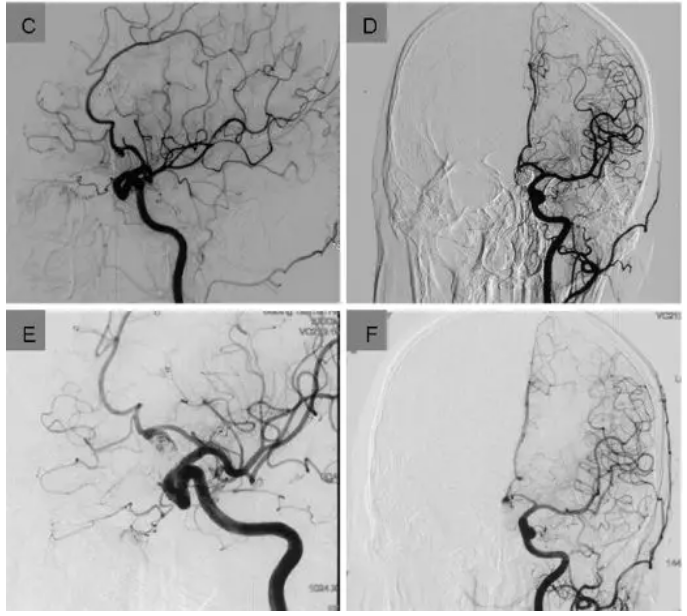 图二:如图所示是一个62岁的女性未破裂动脉瘤患者。动脉瘤位于前交通动脉(A-B);经介入治疗后,可见动脉瘤完全闭塞(C-D);术后9个月,病人逐渐出现视力障碍,复查DSA可见动脉瘤复发(E-F)。