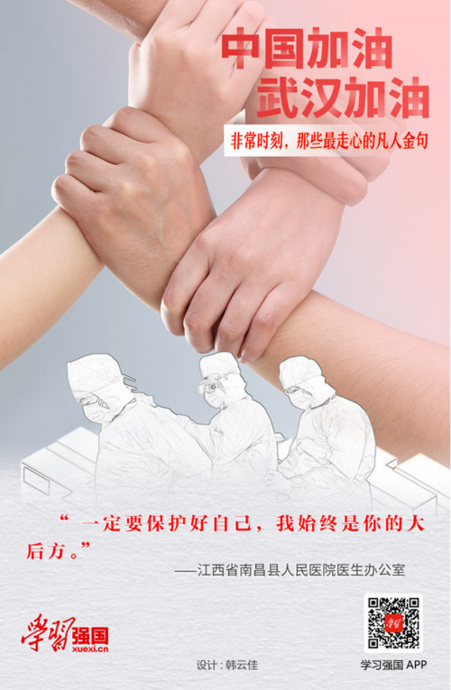 我们很勇敢, 因为指挥我们的是人民的国务院英明的党中央。 我们能坚守, 因为我们有祖国强大的医护后援力量。 我们更自信, 因为我们有14亿人民做坚强后盾——那个不是好儿郎? 湖北——武汉, 中华儿女的目光, 齐聚一个共同的方向。 各类医疗生活物资源源不断驰援疫区, 海外华侨和国内各界人士纷纷慷慨解囊。 那位每月仅有600元收入的师傅, 却拿出一万多元支援胶着的战场。 并不富裕的餐厅店主, 每天给定点医院提供1000份盒饭免单免记账。 听说是在抗疫前线买菜没时间, 菜老板把蔬菜订单送到家门口不要报偿。 听说下夜班没了通勤车, 交警二话没说将其送回她的楼房。 酒店敞开大门给一线医生护士提供免费住宿, 出租车司机不辞辛苦免费接送医护人员去需要的地方。 发薪的时候到了, 火神山病区的建筑工人却提出这样的主张: 原想拿工资给老婆孩子带点春节的礼物, 现在决定捐给医务人员, 表表我们工人一片热心衷肠。 什么人能享受这样的待遇? 什么人值得大家尊重赞赏? 他们是白衣天使, 他们是大爱无疆, 他们是时代最可爱的人, 他们能把医者仁心、救死扶伤的任务担当!